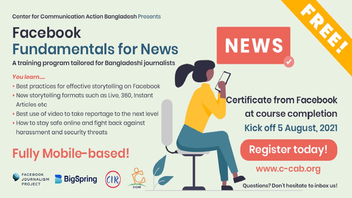 বাংলাদেশের সাংবাদিকদের জন্য ‘সেন্টার ফর কমিউনিকেশন অ্যাকশন বাংলাদেশ’ (সিসিএবি) ফেসবুকের সাথে যৌথভাবে ‘ফেসবুক ফান্ডামেন্টালস্ ফর নিউজ’ শীর্ষক একটি প্রশিক্ষণ কর্মসূচির আয়োজন করছে। এই উদ্যোগে অংশীদার হিসেবে রয়েছে কলম্বোভিত্তিক ‘সেন্টার ফর ইনভেস্টিগেটিভ রিপোর্টিং’ (সিআইআর)। প্রশিক্ষণটি করানো হবে মোবাইল প্ল্যাটফর্মে বিগস্প্রিং অ্যাপের মাধ্যমে। এ প্রশিক্ষণের লক্ষ্য ২০২১ সালের শেষ নাগাদ অন্তত ১০০০ সাংবাদিককে প্রশিক্ষণ দেয়া।