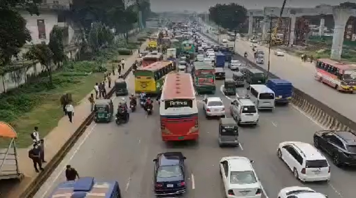 মহাখালী থেকে আব্দুল্লাহপুর পর্যন্ত যানবাহনের দীর্ঘ সারি। যানজটে ঘণ্টার পর ঘণ্টা রাস্তায় অপেক্ষা করতে হচ্ছে যাত্রীদের। গণপরিবহনের পাশাপাশি ব্যক্তিগত বাহনের যাত্রীরাও যানজটে নাকাল।