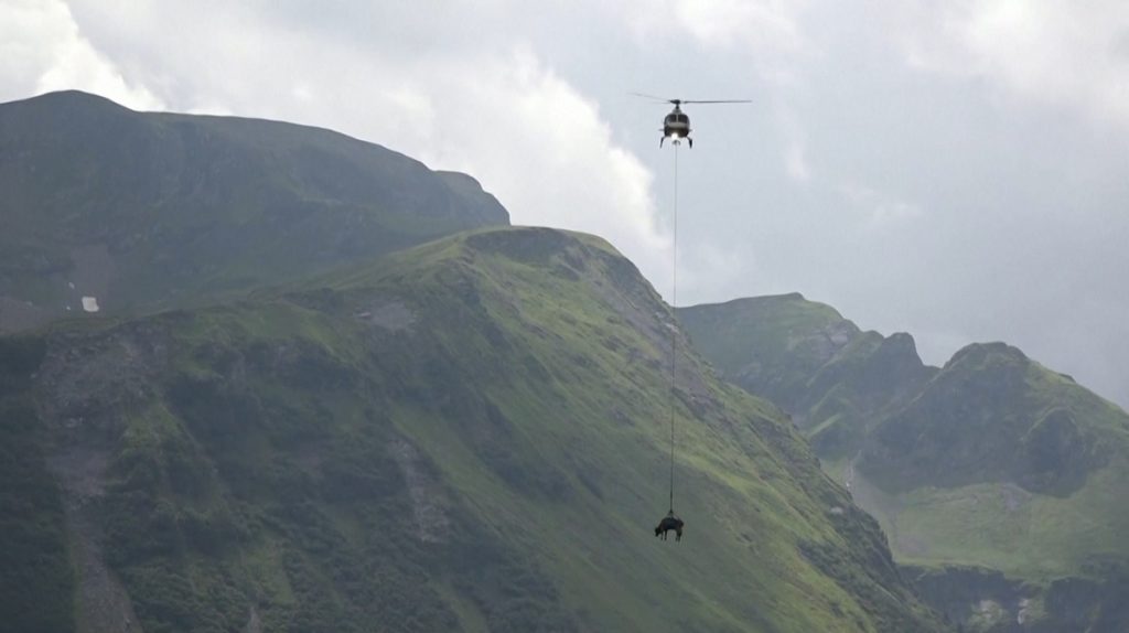 হেলিকপ্টারের সাহায্যে পাহাড় থেকে নামানো হলো গরু! সুইজারল্যান্ডের আল্পস পার্বত্য এলাকায় হয় এ ঘটনা ঘটে।