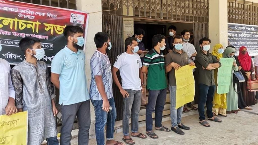 মঙ্গলবার (৩১ আগস্ট) বেলা ১১ টায় বিশ্ববিদ্যালয়ের প্রশাসনিক ভবনের সামনে অবস্থান নিয়ে এ দাবি জানান তারা। এ সময় বিভিন্ন প্ল্যাকার্ড নিয়ে শিক্ষার্থীরা মানববন্ধনে অংশ নেন।