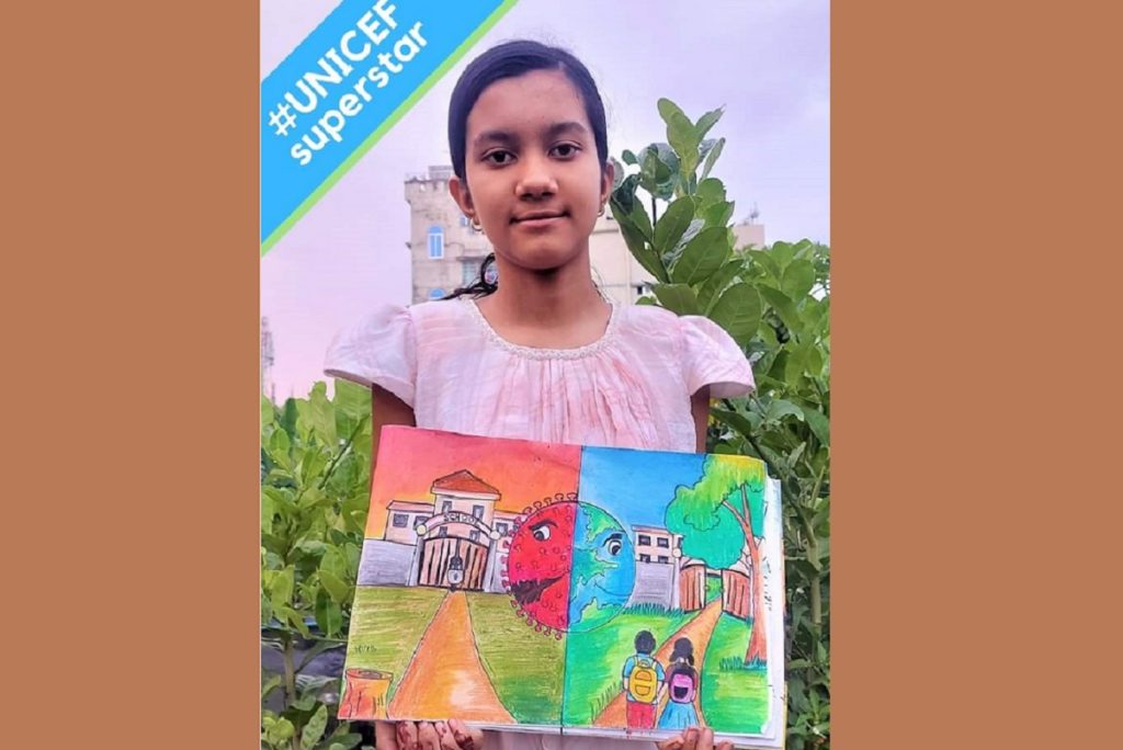করোনা মহামারির কারণে দীর্ঘ ১৭ মাস ধরে স্কুল বন্ধ। ১২ সেপ্টেম্বর থেকে শিক্ষাপ্রতিষ্ঠান খুলে দেয়ার ঘোষণা দিয়েছে সরকার। এতদিন পর স্কুল খোলার স্বপ্ন নিয়ে নরসিংদীর সাটিরপাড়া সরকারি বালিকা উচ্চ বিদ্যালয়ের পঞ্চম শ্রেণীর ছাত্রী অবন্তী দাস আরতীর(১১) আকাঁ ছবি স্থান পেয়েছে ইউনিসেফ বাংলাদেশের ফেসবুক পেজের ‘ইউনিসেফ সুপারস্টার’ এর তালিকায়। মহামারির পর কেমন পৃথিবী হবে, এনিয়ে অবন্তীর কল্পনাই ফুটে উঠেছে তার আকাঁ ছবিতে।