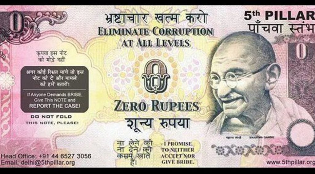 একে বলা হয় ‘জিরো রুপি নোট’ অর্থাৎ এমন একটি নোট, যা মূল্যহীন। ২০০৭ সালে ‘পঞ্চম পিলার’ নামে একটি অলাভজনক সংস্থা এই নোট বাজারে আনে। সরকারি বিভিন্ন স্তরে দুর্নীতি বা ঘুষ দেয়া-নেয়া বন্ধ করার জন্যই এমন অভূতপূর্ব পদক্ষেপ করে সংস্থাটি।