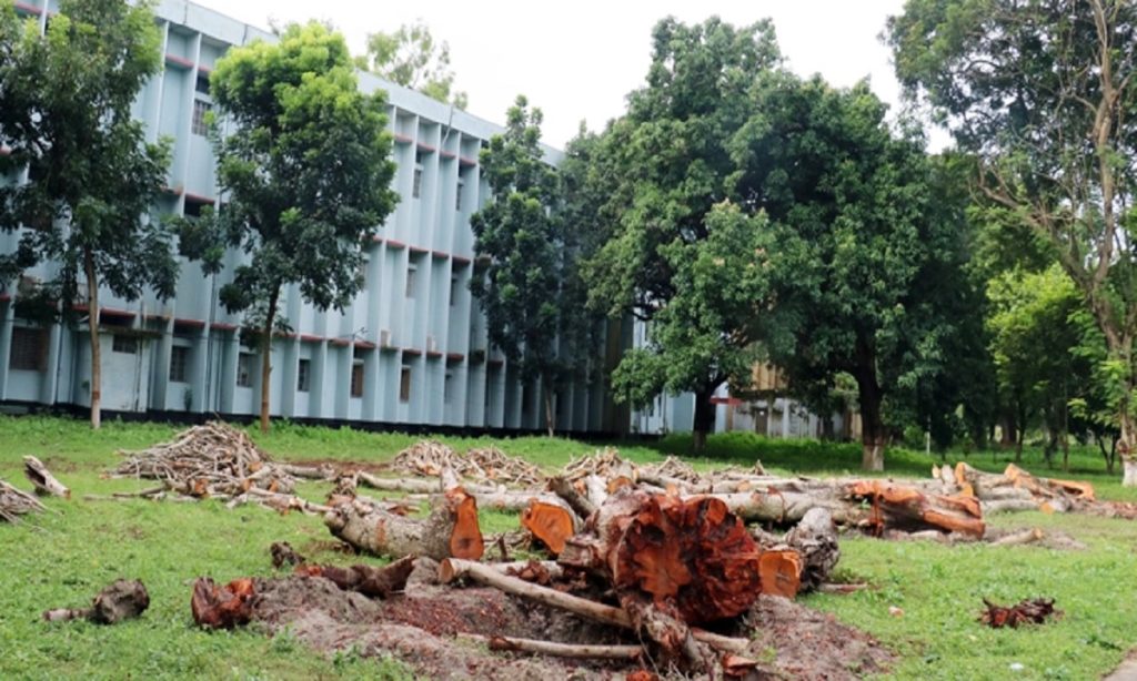 উল্লেখ্য, নতুন প্রশাসনিক এবং একাডেমিক ভবন নির্মাণের জন্য বহু বছরের পুরনো প্রায় ৫০টি গাছ কাটার সিদ্ধান্ত হলে এরমধ্য থেকে ১৫টি গাছ কাটা সম্পন্ন হয়।