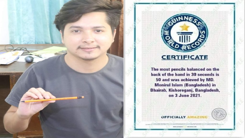 ৩০ সেকেন্ডের মধ্যে সর্বোচ্চ সংখ্যক পেন্সিল এক হাতের উপরে ব্যালেন্স করে গিনেস ওয়ার্ল্ড রেকর্ড করেছেন জাতীয় কবি কাজী নজরুল ইসলাম বিশ্ববিদ্যালয়ের শিক্ষার্থী মো. মনিরুল ইসলাম।