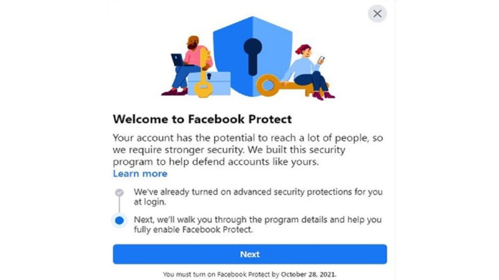 সম্প্রতি সামাজিক যোগাযোগ মাধ্যম ফেসবুকে নতুন একটি নোটিফিকেশনের মাধ্যমে বলা হচ্ছে আগামী ২৮শে অক্টোবরের মধ্যে ‘ফেসবুক প্রোটেক্ট’ চালু করতে হবে। না হয় ফেসবুকের অ্যাকাউন্ট লক হয়ে যাবে।