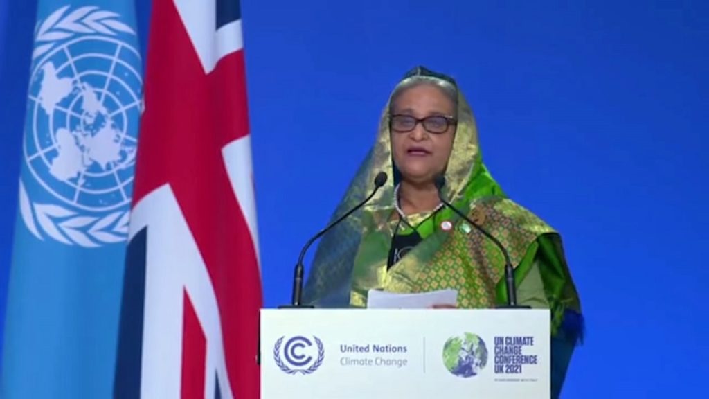 জলবায়ু পরিবর্তনে সবচেয়ে বেশি ক্ষতিগ্রস্ত দেশগুলোর প্রতিনিধি হিসেবে বাংলাদেশের সরকার প্রধান শেখ হাসিনা বলেন, শিল্পোন্নত দেশগুলোর প্রতিশ্রুত ক্ষতিপূরণ অবশ্যই দ্রুত সময়ের মধ্যে দিতে হবে। জলবায়ু পরিবর্তনের প্রভাব মোকাবেলায় বাংলাদেশের অবস্থান তুলে ধরে তিনি বলেন, ধীরে ধীরে জীবাশ্ম জ্বালানির ব্যবহার থেকে সরে আসছে তার দেশ।