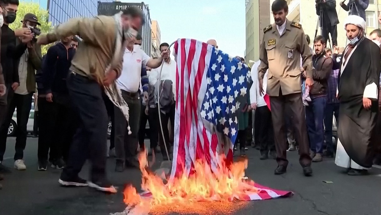 পোড়ানো হচ্ছে যুক্তরাষ্ট্রের পতাকা।