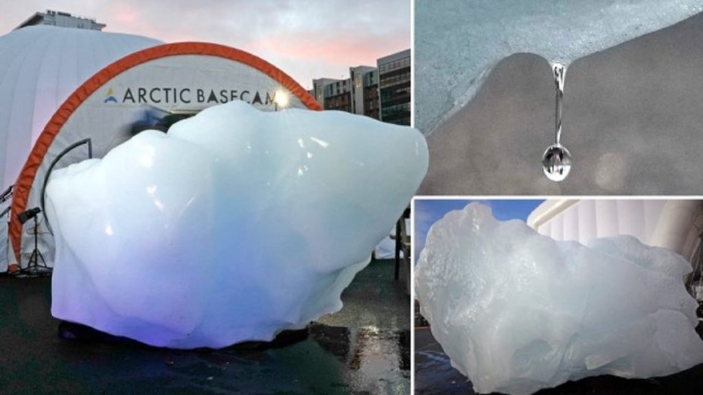 ধীরে ধীরে গলছে উত্তর মেরুর বরফ। জলবায়ুর পরিবর্তনের কারণে কতটা হুমকিতে বিশ্ব? তা জানাতে গ্লাসগোয় জলবায়ু সম্মেলন কেন্দ্রের বাইরে রাখা হয়েছে প্রায় সাড়ে চার টন ওজনের বিশাল আকৃতির বরফ খণ্ড।