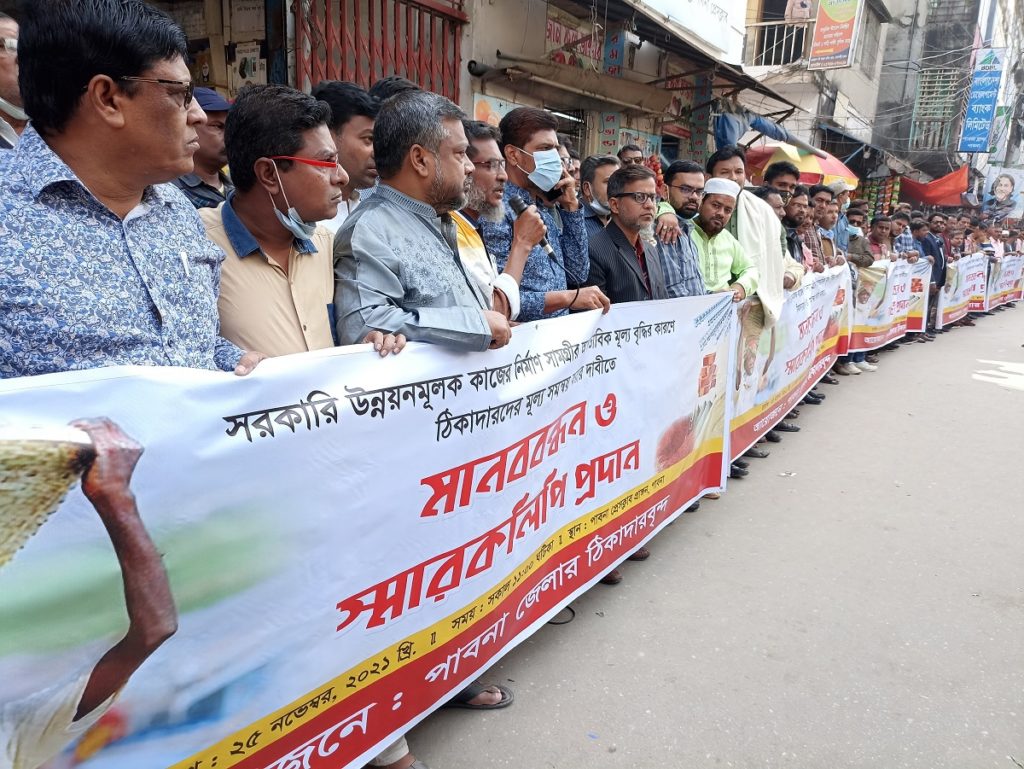 বৃহস্পতিবার (২৫ নভেম্বর) সকাল ১১টায় পাবনা প্রেসক্লাবের সামনে এ মানববন্ধন অনুষ্ঠিত হয়। ঠিকাদার সমিতির আহ্বায়ক আহমদ রঞ্জুর সভাপতিত্বে ও আনিসুজ্জামান দোলনের পরিচালনায় মানববন্ধনে বক্তব্য দেন, সোহেল হাসান শাহীন, হাজী ফারুক হোসেন, জিন্নাত আলী জিন্নাহ, প্রভাস ভদ্র, রফিকুল ইসলাম রুমণ, রুহুল আমিন, শেখ লালু, রুপম সহ পাবনা জেলার সকল ঠিকাদার বৃন্দ।