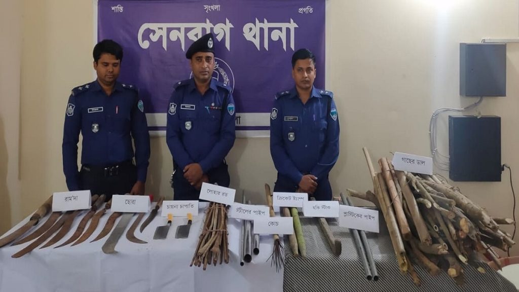 পুলিশ জানায়, গোপন সংবাদের ভিত্তিতে খবর পেয়ে ৮নং বীজবাগ ইউনিয়নের বীজবাগ সরকারি প্রাথমিক বিদ্যালয় ভোট কেন্দ্র সংলগ্ন একটি পুরাতন ক্লাব এলাকায় অভিযান চালানো হয়। এসময় ওই ক্লাবের উত্তর পাশে লাগোয়া ঝোপের মধ্যে পরিত্যক্ত অবস্থায় ৪টি বস্তা উদ্ধার করা হয়। পরে বস্তাগুলো থেকে ৫১টি লাঠি, ১৮টি লোহার রড, ১টি টেঁটা-বল্লম, ৬টি ছোরা, ৪টি রামদা, ২টি চায়না চাপাতি, ২টি ক্রিকেট স্ট্যাম্প, ৩টি স্টিলের পাইপ, ২টি প্লাস্টিকের পাইপ ও ১টি হকিস্টিক উদ্ধার উদ্ধার করা হয়।