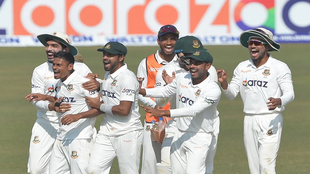 বাংলাদেশের বোলিংয়ের নায়ক তাইজুলকে ঘিরে সতীর্থদের উল্লাস। ছবি: সংগৃহীত