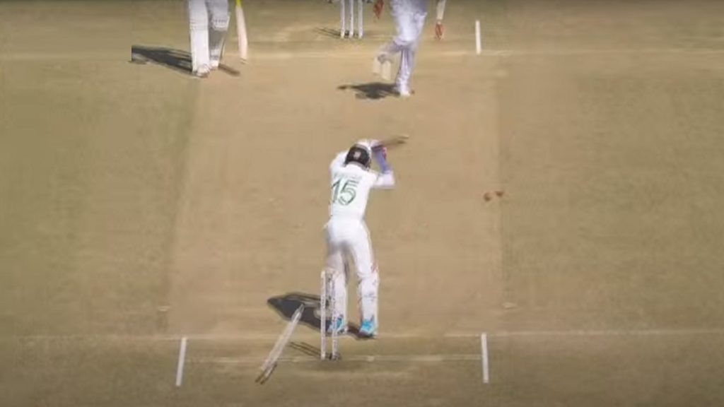 আগের দিনের শেষ সেশনে দ্বিতীয় ইনিংসে ব্যাট করতে নামে বাংলাদেশ। ৪৪ রানের লিড নিয়ে ব্যাটিংয়ে নেমেই শাহিন আফ্রিদির বোলিং তোপে পড়ে ১৫ রানে ৩ এবং ২৫ রানে ৪ উইকেট হারায় টাইগাররা। মুশফিক ও ইয়াসির রাব্বির ব্যাটে বাকি সময় দেখেশুনেই পার করে দেয় বাংলাদেশ। কিন্তু আজ সকালের সেশনে নতুন বল মোকাবিলা করাই ছিল এই দুই ব্যাটারের প্রধান চ্যালেঞ্জ। হাসান আলীর বলটি পিচ করেছিল অফ স্ট্যাম্পের সামান্য বাইরে। কিন্তু বলের লাইন যেমন পড়তে ভুল করেছেন মুশফিক, তেমনি নতুন বলে হাসান আলীর ইনসুইংও চমকে দিয়েছে তাকে। যে বল তিনি ছেড়ে দিয়েছেন সেটিই উপড়ে ফেলেছে তার অফস্ট্যাম্প।