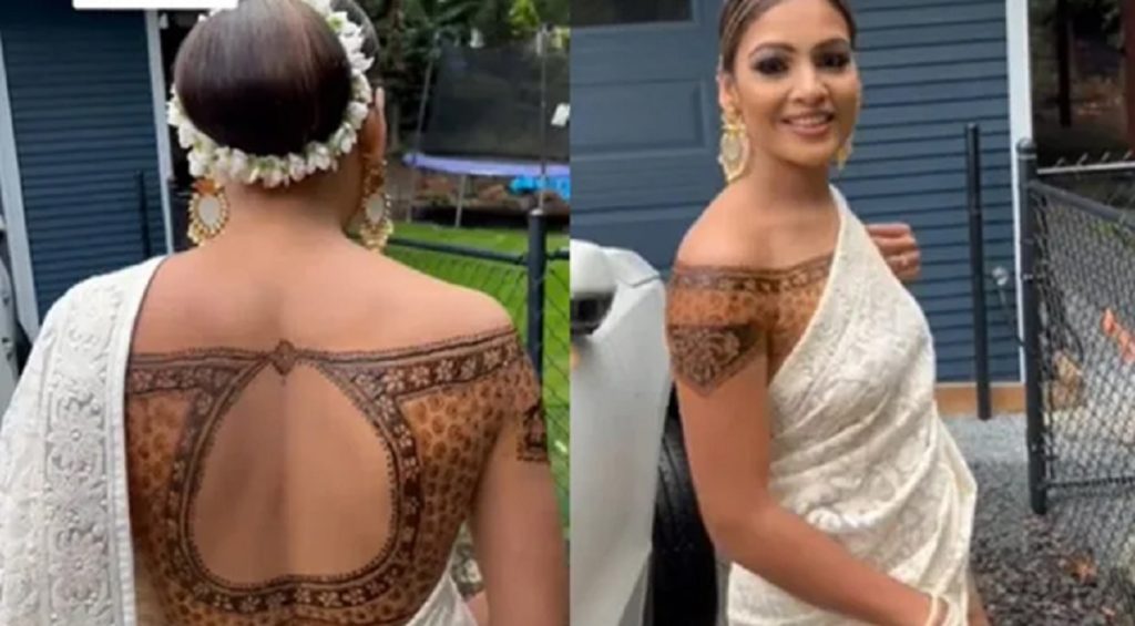 এই ভিডিওতে সাদা শাড়িতে দেখা গেছে ওই নারীকে। তবে নিয়মিত কাপড়ের ব্লাউজের জায়গায় তাকে দেখা গেছে পিঠে মেহেন্দি দিয়ে ব্লাউজের নকশা করে ডিজাইন করা।