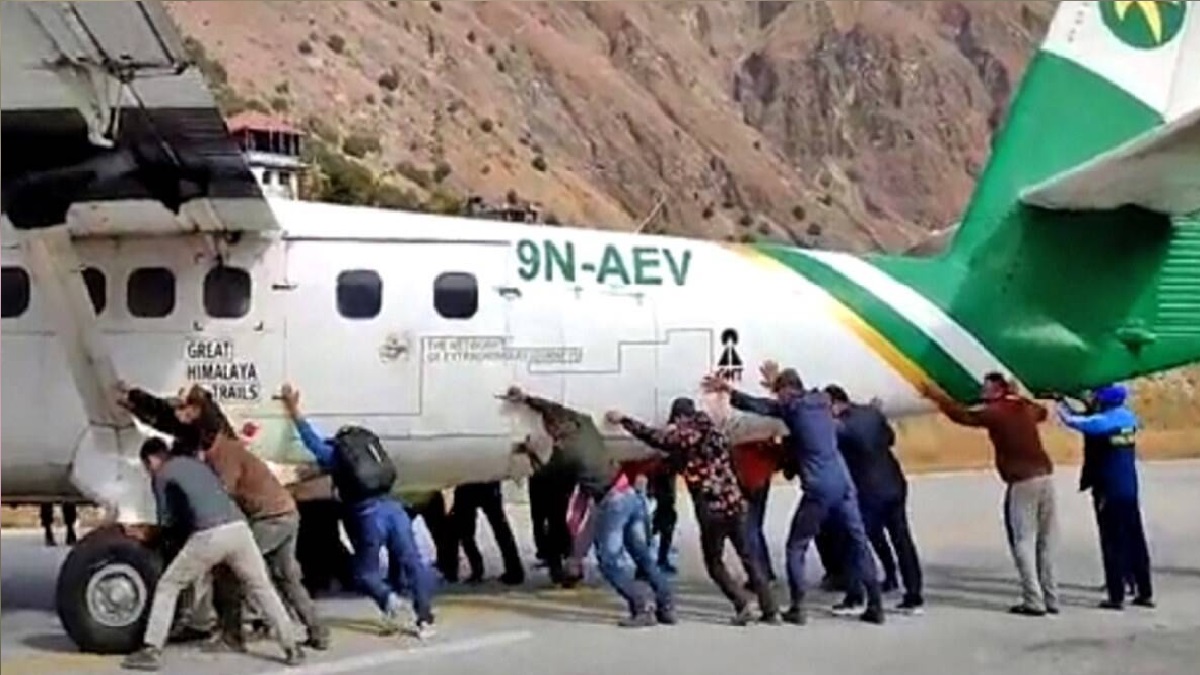 ঘটনাটি ঘটেছে নেপালের কোল তীর বাজুরা বিমানবন্দরে। দেশটির বেসরকারি বিমান সংস্থা তারা এয়ারের একটি বিমান অবতরণের সময় পেছনের টায়ার ফেটে যায়। এ জন্য বিমানটি রানওয়েতেই আটকে যায়। এদিকে রানওয়েতে আটকে থাকা ওই বিমানের কারণে আরেকটি বিমান অবতরণ করতে না পেরে আকাশেই উড়ছিল। বিষয়টি লক্ষ্য করে বিমানবন্দরের নিরাপত্তাকর্মীদের সঙ্গে যাত্রীরাও বিমানটিকে সরাতে হাত লাগায়।