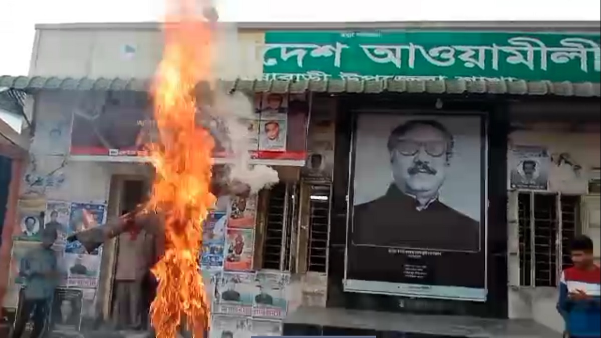 বিক্ষোভ শেষে ডা. মুরাদের কুশপুত্তলিকা দাহ করে জামালপুরের স্থানীয় নেতা-কর্মীরা।