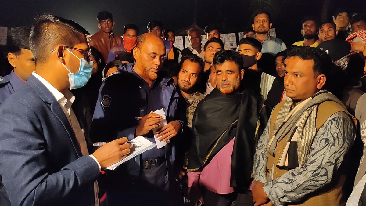 আচরণ বিধি লঙ্ঘন করায় চেয়ারম্যান প্রার্থী মো. শাহজাহান (মাফলার গলায়) কে জরিমানা করছেন আখাউড়ার নির্বাহী ম্যাজিস্ট্রেট কিশোর কুমার দাস।