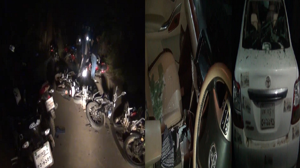হামলায় ক্ষতিগ্রস্থ মোটরসাইকেল ও প্রাইভেট কার।
