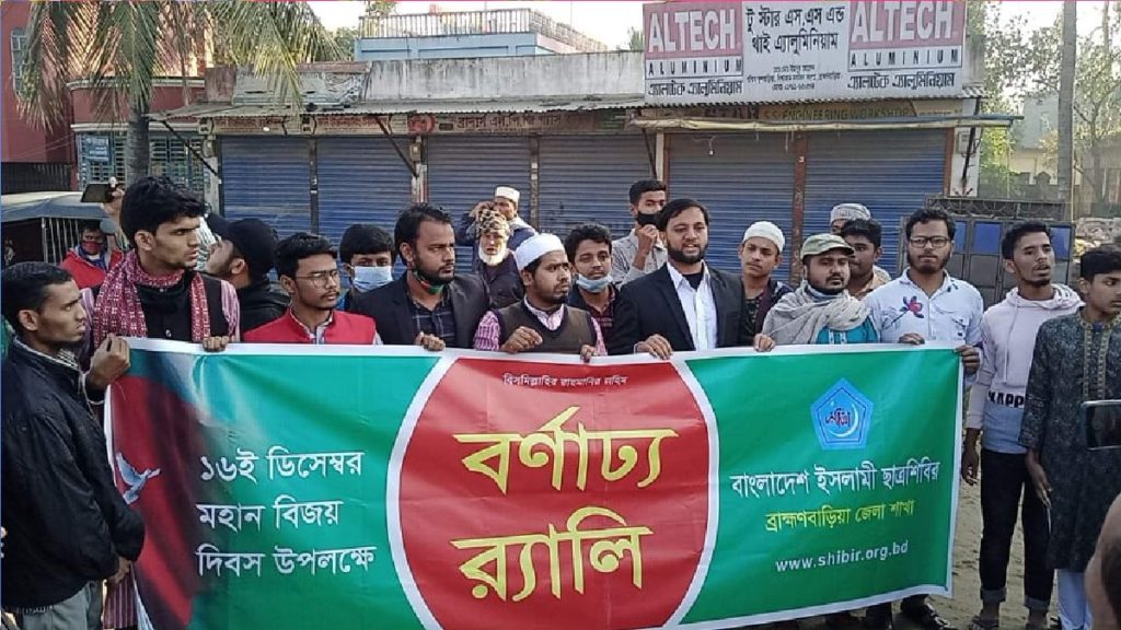 বিজয় দিবসে র্যালি করতে গিয়ে ব্রাহ্মণবাড়িয়ায় ছাত্র শিবিরের ৩ কর্মীকে আটক করা হয়েছে। বৃহস্পতিবার (১৬ ডিসেম্বর) বেলা সাড়ে ১১টার দিকে জেলা শহরের ফুলবাড়িয়া কনভেনশন সেন্টারের সামনে থেকে ছাত্রলীগের নেতাকর্মীরা তাদের আটক করে পুলিশে সোপর্দ করে।