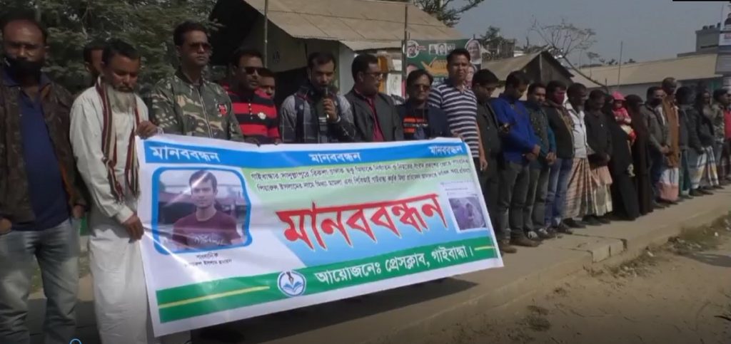 রোববার (১৯ ডিসেম্বর) দুপুরে গাইবান্ধা শহরের ডিবি রোডের নাট্য সংস্থার সামনে এই মানববন্ধন কর্মসূচি অনুষ্ঠিত হয়। প্রেসক্লাব গাইবান্ধার আয়োজনে মানববন্ধন কর্মসূচিতে জেলার ইলেকট্রনিক, প্রিন্ট ও অনলাইন মিডিয়ার সাংবাদিক ছাড়াও বিভিন্ন শ্রেণি পেশার মানুষ অংশ নেয়। সাংকাদিক পিয়ারুল ইসলাম অনলাইন নিউজ পোর্টাল নিউজবাংলার গাইবান্ধা প্রতিনিধি এবং প্রেসক্লাব গাইবান্ধার যুগ্ম সম্পাদক।