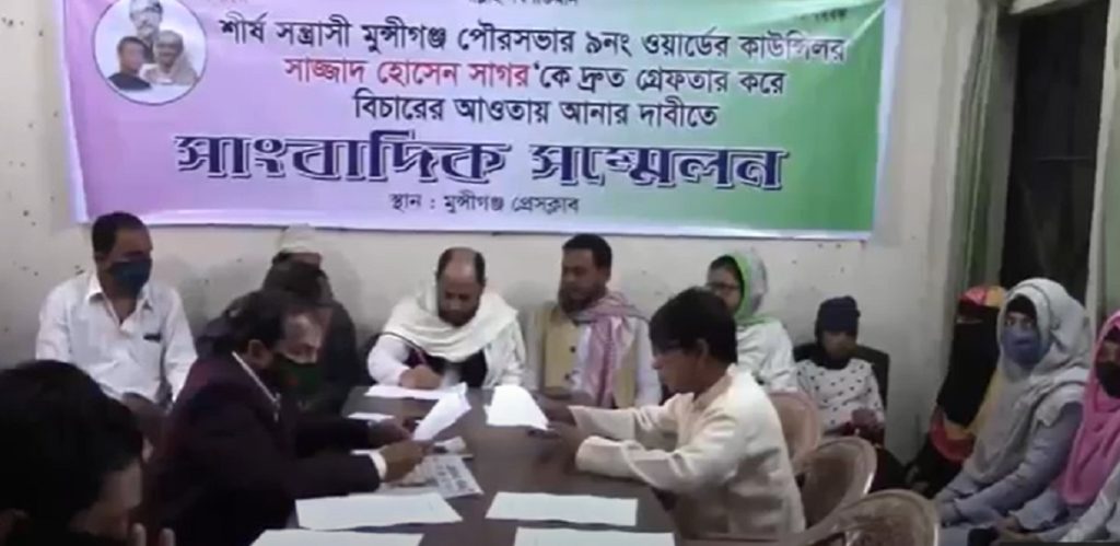 মামুন নামের এক যুবককে হত্যার চেষ্টা ও সন্ত্রাসী কর্মকাণ্ডের অভিযোগে মুন্সিগঞ্জ পৌরসভার কাউন্সিলর ও প্যানেল মেয়র সাজ্জাদ হোসেন সাগরকে গ্রেফতারের দাবিতে সংবাদ সম্মলেন অনুষ্ঠিত হয়েছে। শুক্রবার (২৪ ডিসেম্বর) দুপুরে মুন্সিগঞ্জ প্রেসক্লাব মিলনায়তনে ভুক্তভোগী মামুনসহ তার স্বজন ও স্থানীয়রা এ সংবাদ সম্মলেন করেন।
