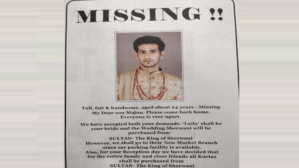 কখনো শুনেছেন পছন্দমতো পাত্রীর সঙ্গে বিয়ে না দেয়ায় বাড়ি ছেড়ে নিরুদ্দেশ হয়ে গিয়েছেন পাত্র? কখনো শুনেছেন, পছন্দের দোকান থেকে শেরওয়ানি না কেনায় পাত্র বাড়ি ছেড়ে চলে গিয়েছেন? শুনতে অদ্ভুত লাগলেও সম্প্রতি ছেলের নিরুদ্দেশ হওয়ার এমনই বিজ্ঞাপন দিয়েছেন এক দম্পতি।
