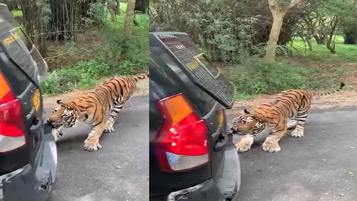 ভিডিওতে দেখা যায়, একটি বাঘ দাঁড়িয়ে থাকা পর্যটকবাহী একটি এসইউভি গাড়িকে কামড় দিয়ে টেনে নিচ্ছে।অন্য গাড়ি থেকে পর্যটকরা এই ঘটনার ভিডিওটি ধারণ করেছেন। এ সময় তাদের চিৎকার করতে শোনা গেছে, ঈশ্বর সে (বাঘ) গাড়িটি টেনে নিয়ে যাচ্ছে। ঘটনাটি ঘটেছে ভারতের কর্ণাটকের ব্যানারঘাটা জাতীয় উদ্যানে। যে ভিডিওটি সামাজিক যোগাযোগ মাধ্যমে ভাইরাল হয়েছে। টুইটারে ভিডিওটি শেয়ার করেছেন মাহিন্দ্র গ্রুপের চেয়ারম্যান আনন্দ মাহিন্দ্র।