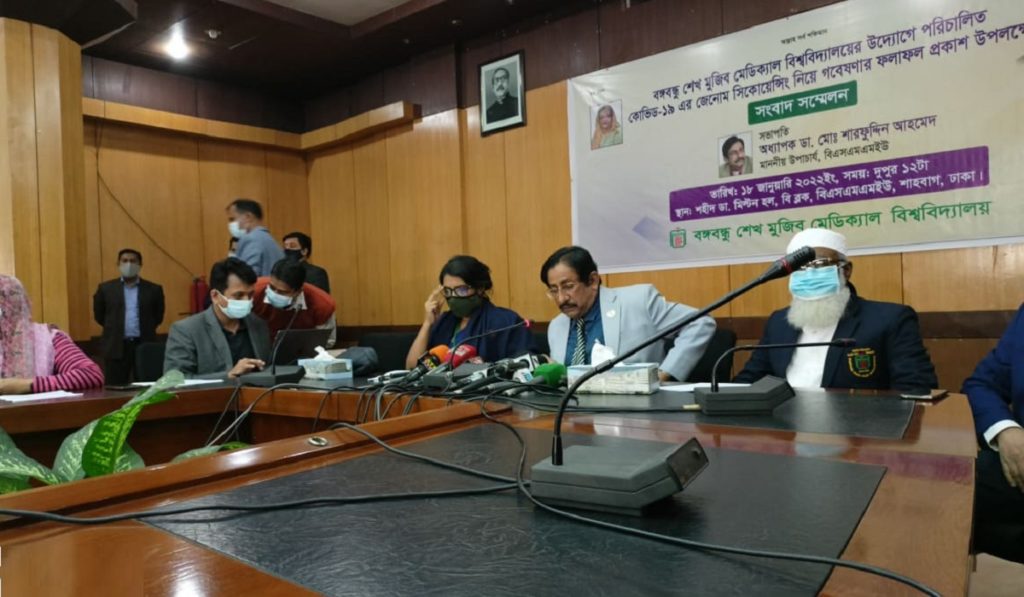 মঙ্গলবার (১৮ জানুয়ারি) এক সংবাদ সম্মেলনে বঙ্গবন্ধু শেখ মুজিব মেডিকেল বিশ্ববিদ্যালয়ের উপাচার্য ও জেনােম সিকোয়েন্সিং রিসার্চ প্রজেক্টের প্রধান পৃষ্ঠপোষক অধ্যাপক ডা. মাে. শারফুদ্দিন আহমেদ এ তথ্য জানান। তিনি বলেন, পরবর্তী মাসে এই ওমিক্রন ভ্যারিয়েন্ট গুণিতক হারে বৃদ্ধির আশংকা করা যাচ্ছে।