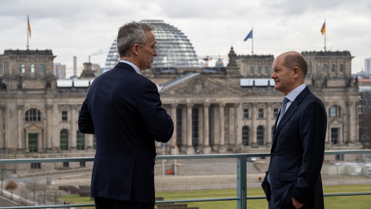 জার্মান চ্যান্সেলর ওলাফ শোলজের (ডানে) সাথে ন্যাটো মহাসচিব জেমস স্টোলটেনবার্গ। ছবি: সংগৃহীত