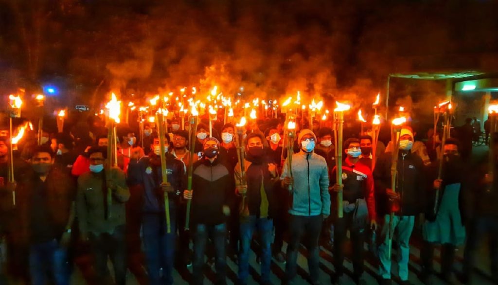 উপাচার্য অধ্যাপক ফরিদ উদ্দিন আহমেদের পদত্যাগের দাবিতে মশাল মিছিল করেছে শাহজালাল বিজ্ঞান ও প্রযুক্তি বিশ্ববিদ্যালয়ের আন্দোলনরত শিক্ষার্থীরা। সোমবার (২৪ জানুয়ারি) রাত সাড়ে ৯টার দিকে ক্যাম্পাসের গোল চত্বর থেকে মিছিল শুরু হয়ে ক্যাম্পাসের বিভিন্ন দিক প্রদক্ষিণ করে মুক্তমঞ্চে এসে শেষ হয়। মশাল মিছিলে কয়েকশ শিক্ষার্থী অংশ নেন।