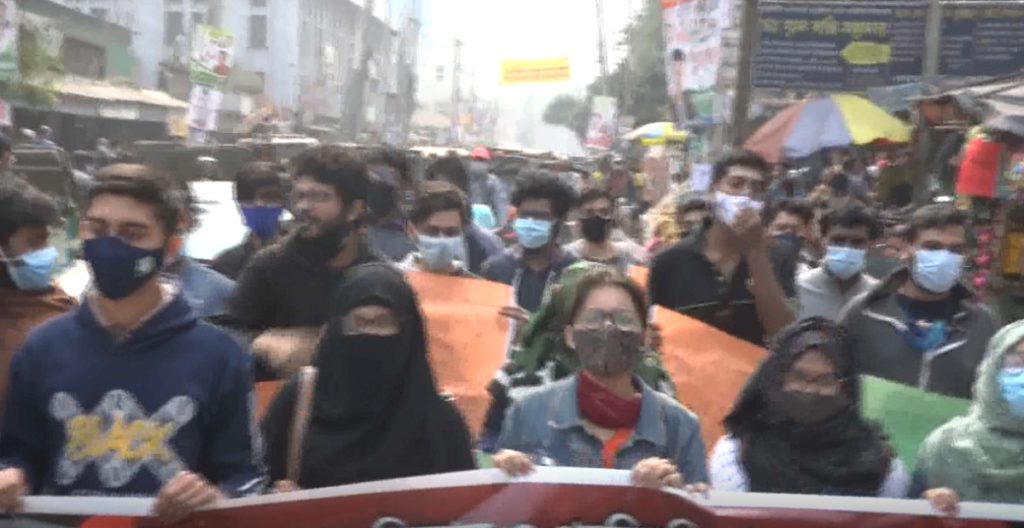 শাবিপ্রবির শিক্ষার্থী জাকিয়া জান্নাতের সভাপতিত্বে মানববন্ধনে বক্তব্য রাখেন, রাজশাহী বিশ্ববিদ্যালয়ের শিক্ষার্থী মাহইয়ী সারদ, শাহজালাল বিজ্ঞান ও প্রযুক্তি বিশ্ববিদ্যালয়ে শিক্ষার্থী রাফিদি ইসলাম, তামান্না ইসলাম তিথি, ঢাকা মেডিকেল কলেজের মো. রাফি, জেলা ছাত্র মৈত্রীর সভাপতি ফাহিম মুনতাসীর ও চট্টগ্রাম বিশ্ববিদ্যালয়ের মো. আশিক এবং হোমায়রা হিমু প্রমুখ।