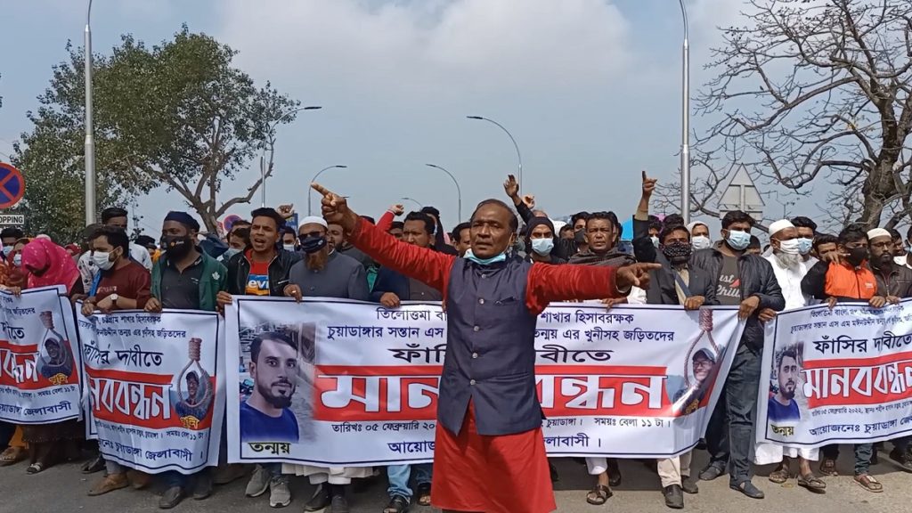 চট্টগ্রামের বাবুর্চির ছুরিকাঘাতে নিহত এসএম মঈন উদ্দীন তন্ময়ের হত্যাকারীর বিচারের দাবিতে চুয়াডাঙ্গায় মানববন্ধন করা হয়েছে। শনিবার (৫ ফেব্রুয়ারি) বেলা ১১টায় চুয়াডাঙ্গা শহরের শহীদ হাসান চত্বর এলাকায় এ মানববন্ধনে অংশ নেয় নিহতের স্বজন, বন্ধু-পরিজনসহ স্থানীয় লোকজন। এসময় বক্তারা তার হত্যাকারীর ফাঁসির দাবি জানান। সেখান থেকে শহরে একটি বিক্ষোভ মিছিল করা হয়। পরে চুয়াডাঙ্গা জেলা প্রশাসক ও পুলিশ সুপারের কাছে স্মারকলিপি পেশ করা হয়।