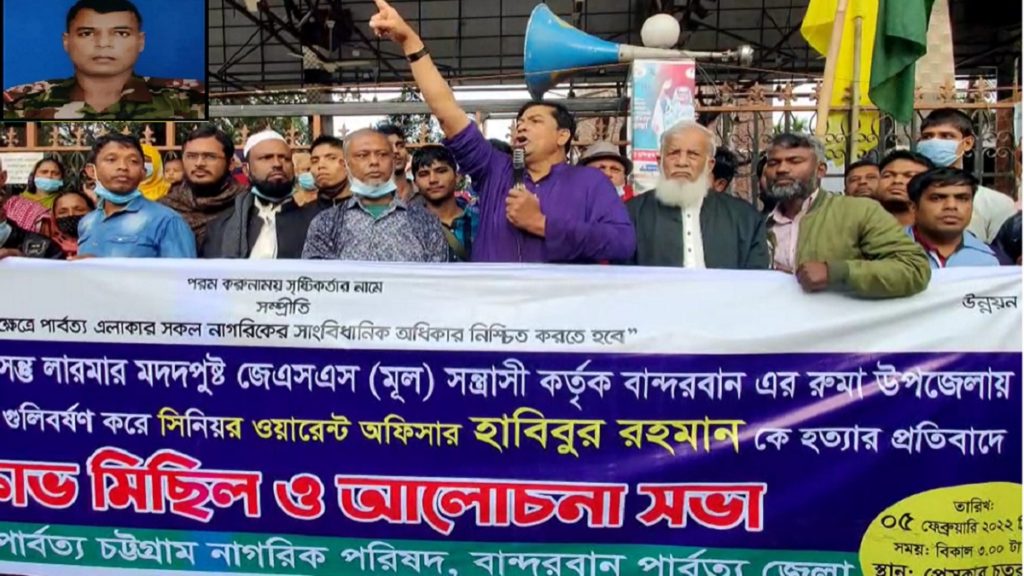 জেএসএস (মূল) কর্তৃক সেনাবাহিনীর সিনিয়র ওয়ারেন্ট অফিসার হাবিবুর রহমানকে গুলি করে হত্যার প্রতিবাদে বিক্ষোভ মিছিল ও প্রতিবাদ সমাবেশ করেছে পার্বত্য চট্টগ্রাম নাগরিক পরিষদ।