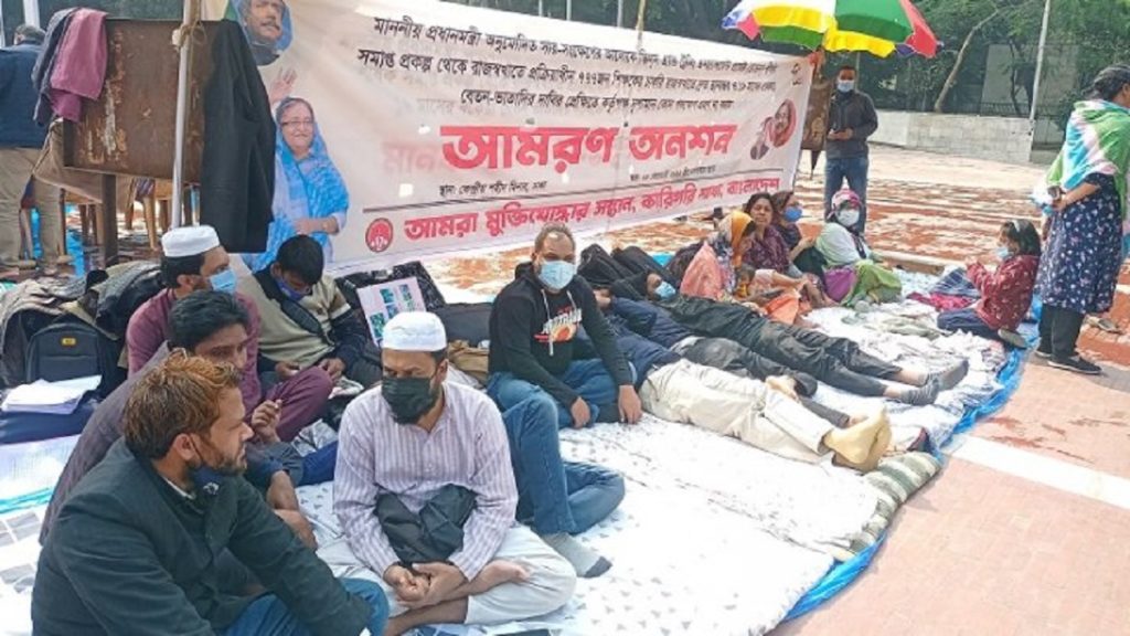 কারিগরি শিক্ষা অধিদফতরের ৭৭৭ জন শিক্ষক বেতন পাচ্ছেন না ১৯ মাস ধরে। এজন্য কেন্দ্রীয় শহিদ মিনারে আমরণ অনশন করছেন তারা। ‘আমরা মুক্তিযোদ্ধার সন্তান’ ব্যানারে গত ১ ফেব্রুয়ারি থেকে এই কর্মসূচি পালন করে আসছেন তারা।