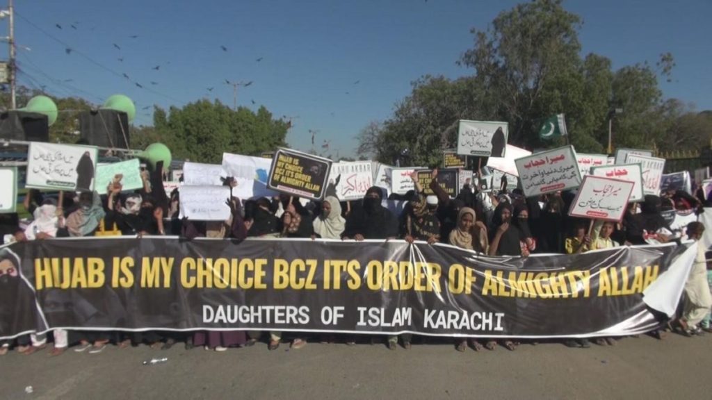 ভারতের কর্ণাটকে শিক্ষা প্রতিষ্ঠানে হিজাব নিষিদ্ধের তীব্র নিন্দা জানিয়েছে পাকিস্তান। রোববার (১৩ ফেব্রুয়ারি) এই ইস্যুতে দেশটিতে বিক্ষোভ করেন হাজারও নারী।
