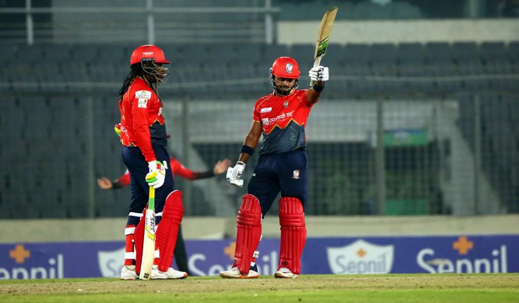 ৩৪ বলে ৫৮ রান করা সৈকত আলী ফিরেছেন তানভির ইসলামের বলে। সৈকতের বিদায়ের পরই হাতখুলে ব্যাট করেন গেইল। ৩১ বলে ৩৩ রান করার পর সুনিল নারিনের বলে এলবিডব্লিউ হয়েছেন ইউনিভার্স বস।