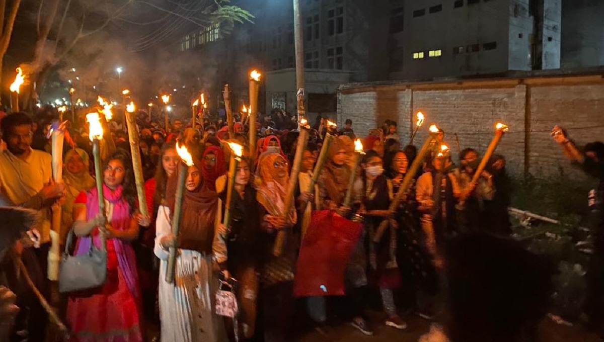 গোপালগঞ্জে বঙ্গবন্ধু শেখ মুজিবুর রহমান বিজ্ঞান ও প্রযুক্তি বিশ্ববিদ্যালয়ের ছাত্রীকে ‘সংঘবদ্ধ ধর্ষণের’ ঘটনার প্রতিবাদে এবং দোষীদের গ্রেফতারের দাবিতে মশাল মিছিল করেছে আন্দোলনরত শিক্ষার্থীরা।