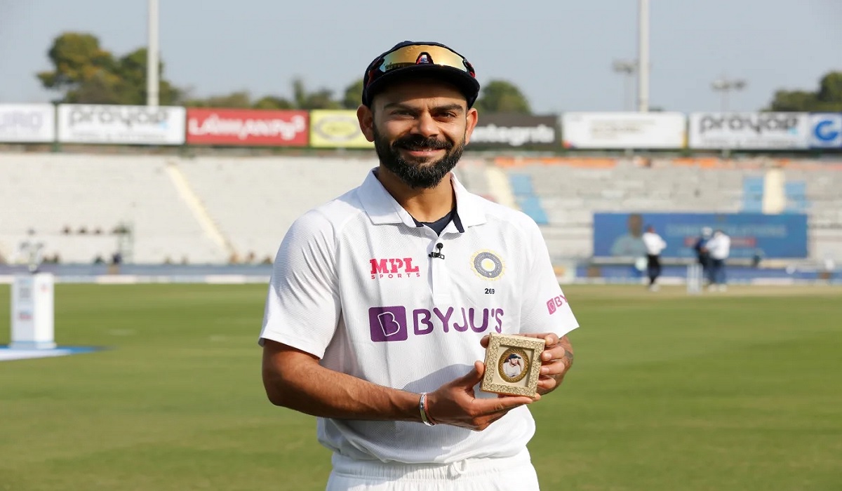 শততম টেস্টের স্মারক হাতে ভিরাট কোহলি। ছবি: সংগৃহীত