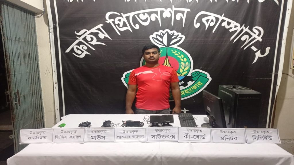 ইলেকট্রিক ডিভাইসসহ শিহাবুল ইসলাম শিহাব (২৪) নামের একজনকে গ্রেফতার করা হয়। ধৃত শিহাবের কাছ থেকে একটি কম্পিউটার, কি-বোর্ড, মাউস, পেনড্রাইভ, কার্ডরিডার, ইউএসবি ক্যাবল, সাউন্ডবক্স ইত্যাদি মালামাল উদ্ধার করে।