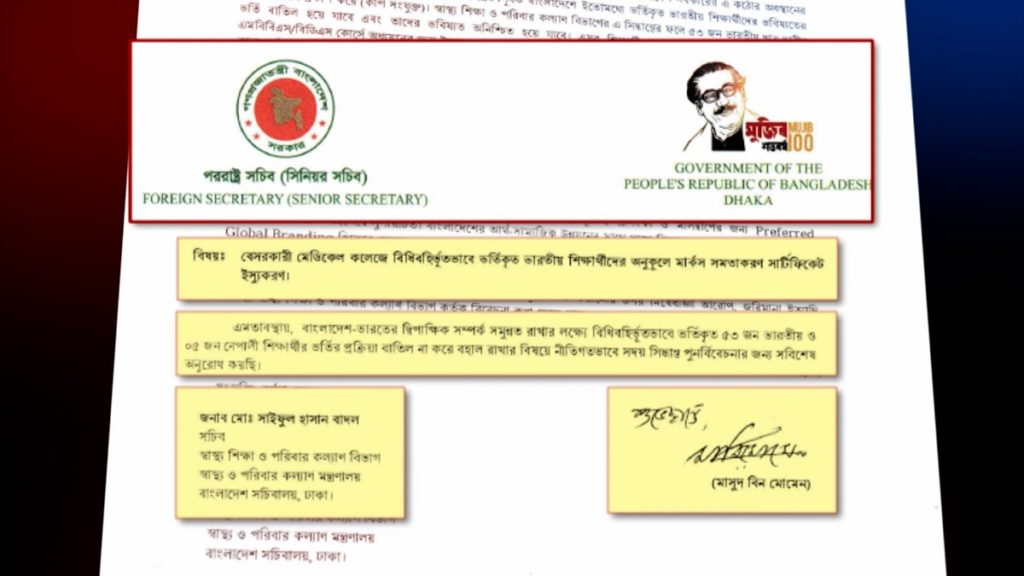 বাংলাদেশে পড়তে আসা ৫৮ বিদেশি মেডিকেল শিক্ষার্থীর জীবন অনিশ্চতায়। ক্লাস শুরুর পর ইকুইভ্যাল্যান্ট সার্টিফিকেট না থাকায় তাদের নিজ দেশে ফিরতে বলেছে স্বাস্থ্য শিক্ষা বিভাগ। তবে ভারত সরকারের অনুরোধে ভর্তি বাতিল না করে বিষয়টি সমাধানের চেষ্টা করছে পররাষ্ট্র মন্ত্রণালয়। কবে নাগাদ ভারত ও নেপালের শিক্ষার্থীদের এই অনিশ্চয়তা কাটবে, তা বলতে পারেননি স্বাস্থ্য শিক্ষা সচিব।