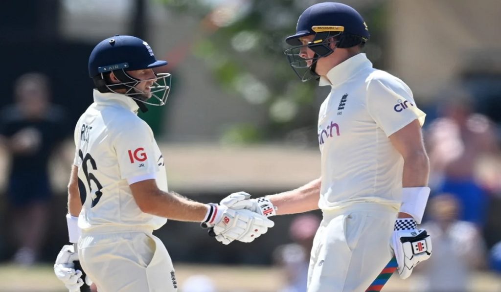 জবাবে ব্যাট করতে নেমে শুরুতেই কেমার রোচের বলে ওপেনার এলেক্স লিসের উইকেট হারায় ইংল্যান্ড। তবে দ্রুতই পরিস্থিতি নিজেদের দখলে নিয়ে নেন জ্যাক ক্রলি ও জো রুট। দ্বিতীয় উইকেট জুটিতে এই দুই ব্যাটার যোগ করেন ১৯৩ রান। ব্যাট হাতে ওপেনার জ্যাক ক্রলি ১১৭ ও অধিনায়ক জো রুট ৮৪ রানে অপরাজিত আছেন।