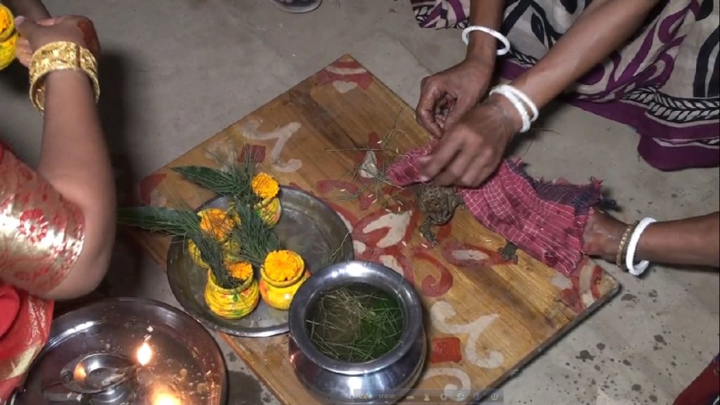 ছেলে-বুড়ো সকলের মুখর উপস্থিতিতে, সাজানো বর-কনের মাধ্যমেই সম্পন্ন হয় ব্যাঙের বিয়ে। বিয়েতে মানা হয় ধর্মীয় সকল আচার। অধিবাসে ছিল ধামাইল, ছিল বাড়ি বাড়ি গিয়ে গীতের সাথে সোহাগ সাধাও। নিয়ম মেনে বিয়ের আগে পানি ভরে গোসল করানো হয় ব্যাঙ বর-কনেকে।
