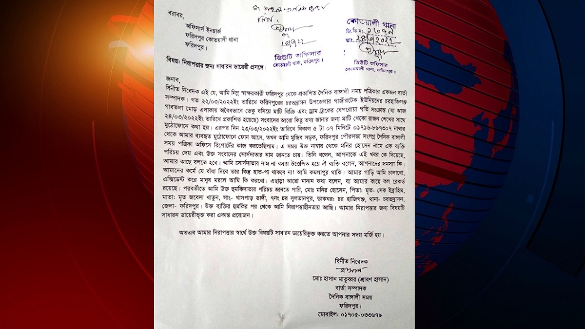 ফরিদপুর থেকে প্রকাশিত দৈনিক বাঙ্গালী সময় পত্রিকায় অবৈধভাবে মাটি কেটে বিক্রি সংক্রান্ত একটি সংবাদ প্রকাশ করায় ওই প্রতিবেদককে হাত-পা কেটে ফেলার হুমকি দেয়ার ঘটনা ঘটেছে। এ বিষয়ে ভুক্তভোগী ওই সাংবাদিক শ্রাবণ হাসান ফরিদপুর কোতয়ালী থানায় একটি সাধারণ ডায়েরি করেছেন।
