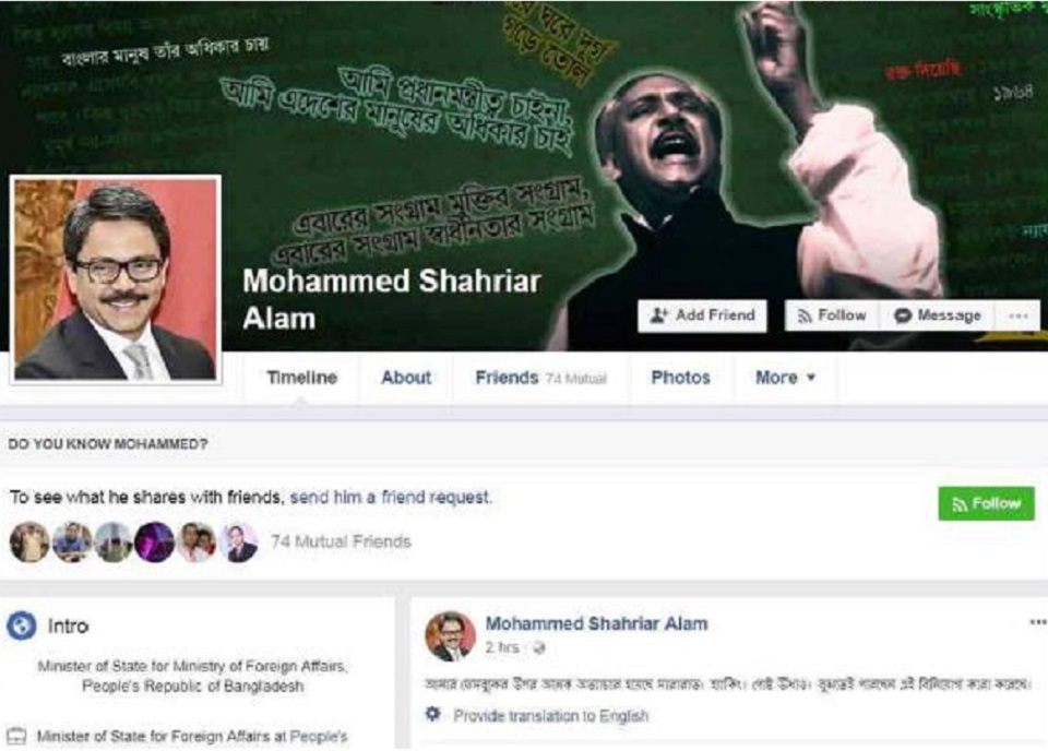হ্যাকিংয়ের শিকার হয়েছে পররাষ্ট্র প্রতিমন্ত্রী শাহরিয়ার আলমের ফেসবুক পেজ। সোমবার প্রতিমন্ত্রী তার ফেসবুক পেইজে বিএনপির ভারপ্রাপ্ত চেয়ারম্যান তারেক রহমানের পাসপোর্টের ফটোকপি এবং যুক্তরাজ্যের স্বরাষ্ট্র দপ্তরে তার জমা দেওয়া আবেদনের একটি কপি পোস্ট করেন। এসব কপি হ্যাক করা হয়েছে এবং তা উধাও হয়ে গেছে বলে প্রতিমন্ত্রী তার পেইজে জানিয়েছেন।