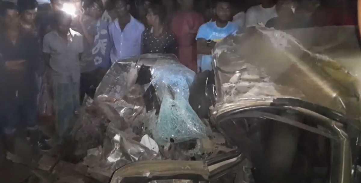 ট্রাকের চাপায় দুমড়েমুচড়ে যায় মাইক্রোবাসটি।