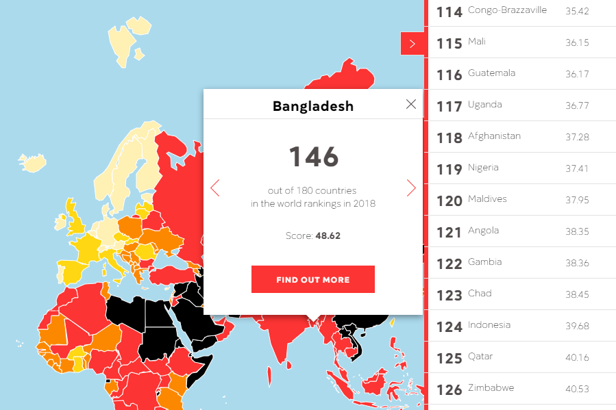 তাতে বাংলাদেশের অবস্থান ১৮০ দেশের মধ্যে ১৪৬। গত বছর একই অবস্থানে থাকলেও স্কোরের দিক থেকে বাংলাদেশের পরিস্থিতি আরও খারাপ হয়েছে। ২০১৭ সালে বাংলাদেশের নেতিবাচক স্কোর ছিল ৪৮ দশমিক ৩৬। এ বছর তা বেড়ে হয়েছে ৪৮ দশমিক ৬২।