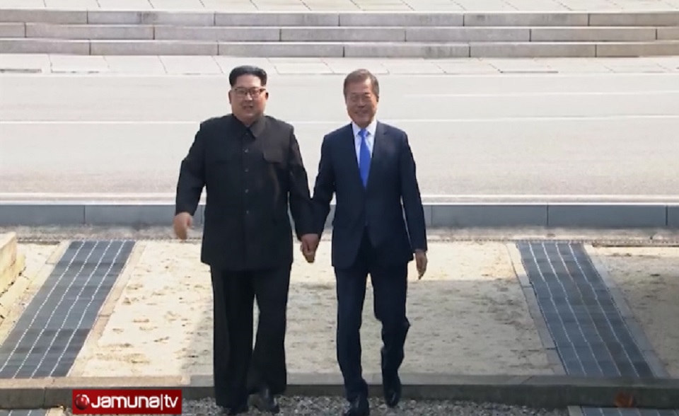 সীমান্ত শহরটিতে কিম জুং উনকে স্বাগত জানান মুন জে ইন। ১১ বছরের মধ্যে প্রথম আন্তঃকোরিয়া শীর্ষ সম্মেলন এটি।