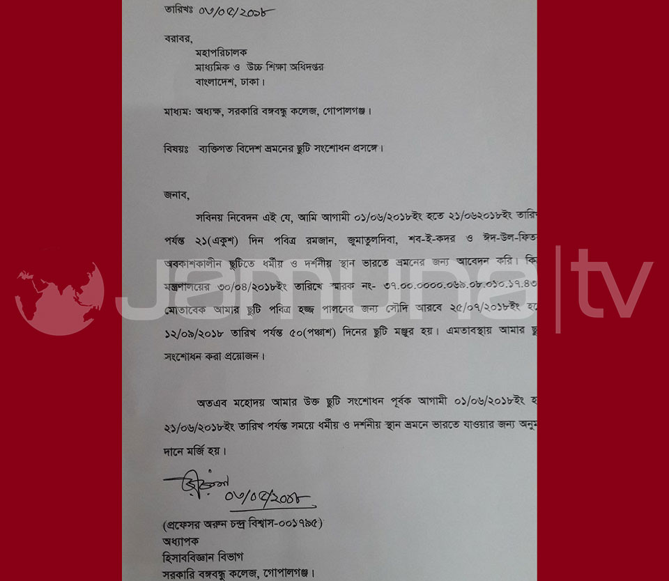 হজব্রত পালনে ৫০ দিনের ছুটি পাওয়ার ঘটনায় বিব্রত গোপালগঞ্জের সরকারি বঙ্গবন্ধু কলেজের হিসাব বিজ্ঞান বিভাগের অধ্যাপক অরুন চন্দ্র বিশ্বাস। ছুটি সংশোধনের জন্য মাধ্যমিক ও উচ্চ শিক্ষা অধিদপ্তর বরাবর পুনরায় আবেদন করেছেন তিনি।