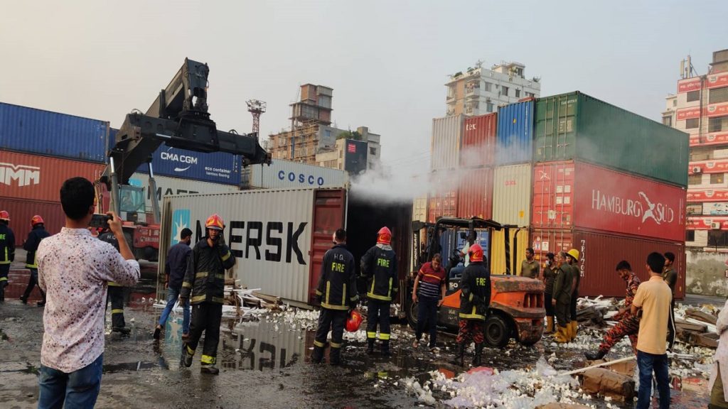কনটেইনারে আগুন লেগে পুড়ে গেছে আমদানী করা বেশ কিছু ইলেকট্রনিক পণ্য। প্রত্যক্ষদর্শী কয়েকজন জানান, বিকেল সাড়ে তিনটা নাগাদ একটি কনটেইনার থেকে ধোঁয়া বেরুতে দেখেন তারা। নিজস্ব অগ্নিনির্বাপন যন্ত্রে চেষ্টা করেন আগুন নিয়ন্ত্রণের। ব্যর্থ হয়ে পৌনে চারটায় খবর দেন ফায়ার সার্ভিসকে। ৪ টা থেকে ফায়ারের ৩ ইউনিট যন্ত্রের সাহায্যে কনটেইনারটি নামিয়ে আনা হয়। ১ ঘণ্টায় নিয়ন্ত্রণে আসে আগুন। কনটেইনার খোলার পর দেখা যায়, চীন ও তাইওয়ান থেকে আমদানি করা বৈদ্যুতিক সরঞ্জাম। ফায়ার সার্ভিসের প্রাথমিক ধারণা, তীব্র গরমে আমদানি পণ্যের সাথে থাকা ব্যাটারিতে আগুনের সূত্রপাত হয়ে থাকতে পারে।