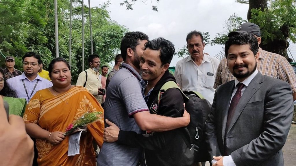 সকাল থেকেই ত্রিপুরা সীমান্তের এপারে আখাউড়া ইমিগ্রেশন চেকপোস্টের নোম্যান্সল্যান্ডে অপেক্ষা করছিলেন স্বজনরা। অপেক্ষার প্রহর ভেঙে বেলা ঠিক ১১টা ৭ মিনিটে ভারতের ত্রিপুরার আগরতলায় বাংলাদেশ সহকারী হাইকমিশনার আরিফ মোহাম্মদ বাংলাদেশি পাঁচজন নাগরিককে আখাউড়া-আগরতলা নোম্যান্সল্যান্ডে নিয়ে আসেন। এ সময় আখাউড়া উপজেলা নির্বাহী কর্মকর্তা রোমানা আক্তারের মাধ্যমে নিজ পরিবারের কাছে তাদের পাঁচজনকে তুলে দেয়া হয়।