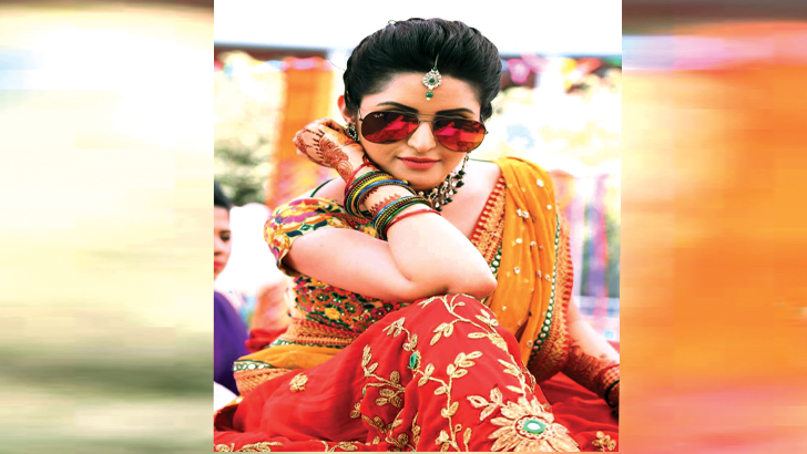 মেহেদি রাঙানো হাত, তাতে আবার রকমারি চুড়ি। মাথায় টিকলি, চোখে রঙিন চশমা। গায়ে জড়ানো হলুদ আর লাল মেশানো রঙের শাড়ি- এ কোনো নতুন পরীমনি?